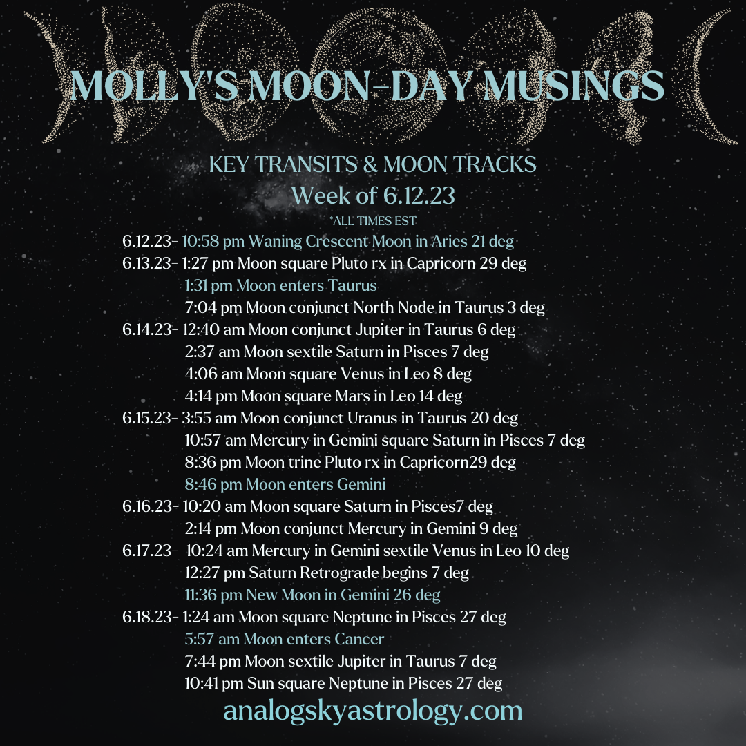 Moon opens on Moon-day, June 12th in the sign of Aries. Late in the day, she finds herself in the third decan of Aries, winding down in her waning crescent phase. A balsamic moon, a darkening light, highlighting the third decan’s ruler, Lord of Completion. Balsamic Moon’s speak to a shutting down, a quieting, a falling away. This isn’t always easy to do when the Moon is in fiery Aries, an initiating and energetic space. Yet this is where she floats. On Mar’s day, June 13th, the Moon in Mar’s temple of Aries, will have one last hard aspect to Pluto in Capricorn (also a place where Mars has dignity) at 29 degrees. This very last hard aspect severs all the Moon has endured leading up to this moment. It is an aspect that makes us turn inward and release any final deeper emotions that allow us to regenerate in time for the next lunar cycle, an exciting, social and frenetic Gemini new Moon.