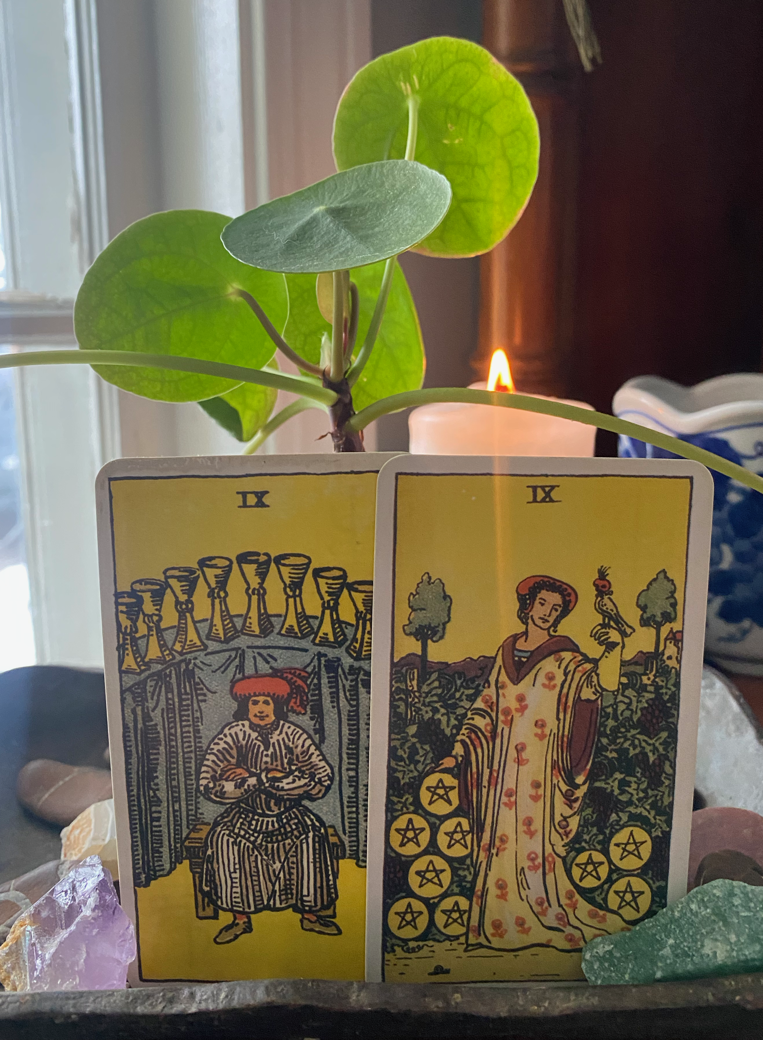These two cards represent the decan the Sun and Moon occupy during the Full Moon in Pisces. 9’s represent the closing out of a cycle.