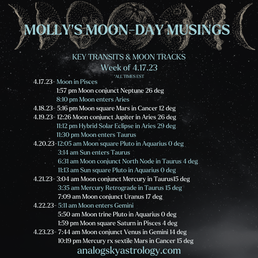 This week should feel unusually potent, especially if your own birth chart is receiving direct hits from the planets this week. Depending on your location, a hybrid Solar Eclipse in the sign of Aries will occur on the 19th or 20th. This is followed quickly by both luminaries squaring Pluto and a Mercury retrograde.