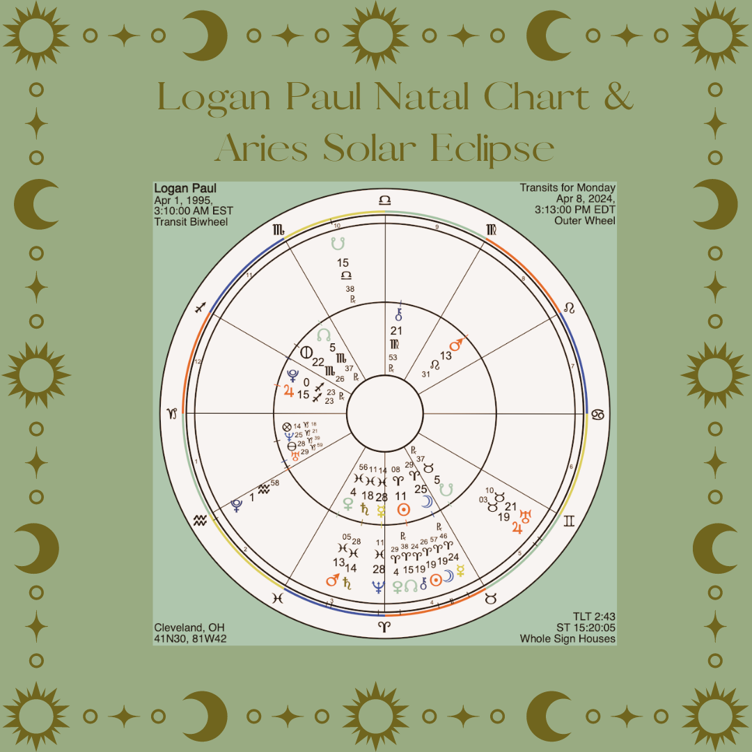 Logan Paul was born with both the Sun and Moon in Aries, and the most recent total eclipse in Aries, April 8th hit right over his natal New Moon and the eclipse crossed right over his birth home, Cleveland. This eclipse over both of his luminaries can symbolize a darkening of his own light, a fall from grace if you will. The lawsuit regarding the caffeine was filed April 8th, the day of the eclipse. This eclipse, and the recent Scorpio Full Moon have brought both lawsuits now into the public eye. On April 18th, the judge heard the case for dismissal of the PFA’s lawsuit, Venus and Mercury rx conjoined near his natal Sun and Moon on this day in the same sign of the eclipse. In regards to essential dignity, Venus is in her detriment and Mercury is retrograde. The verdict has not been decided.