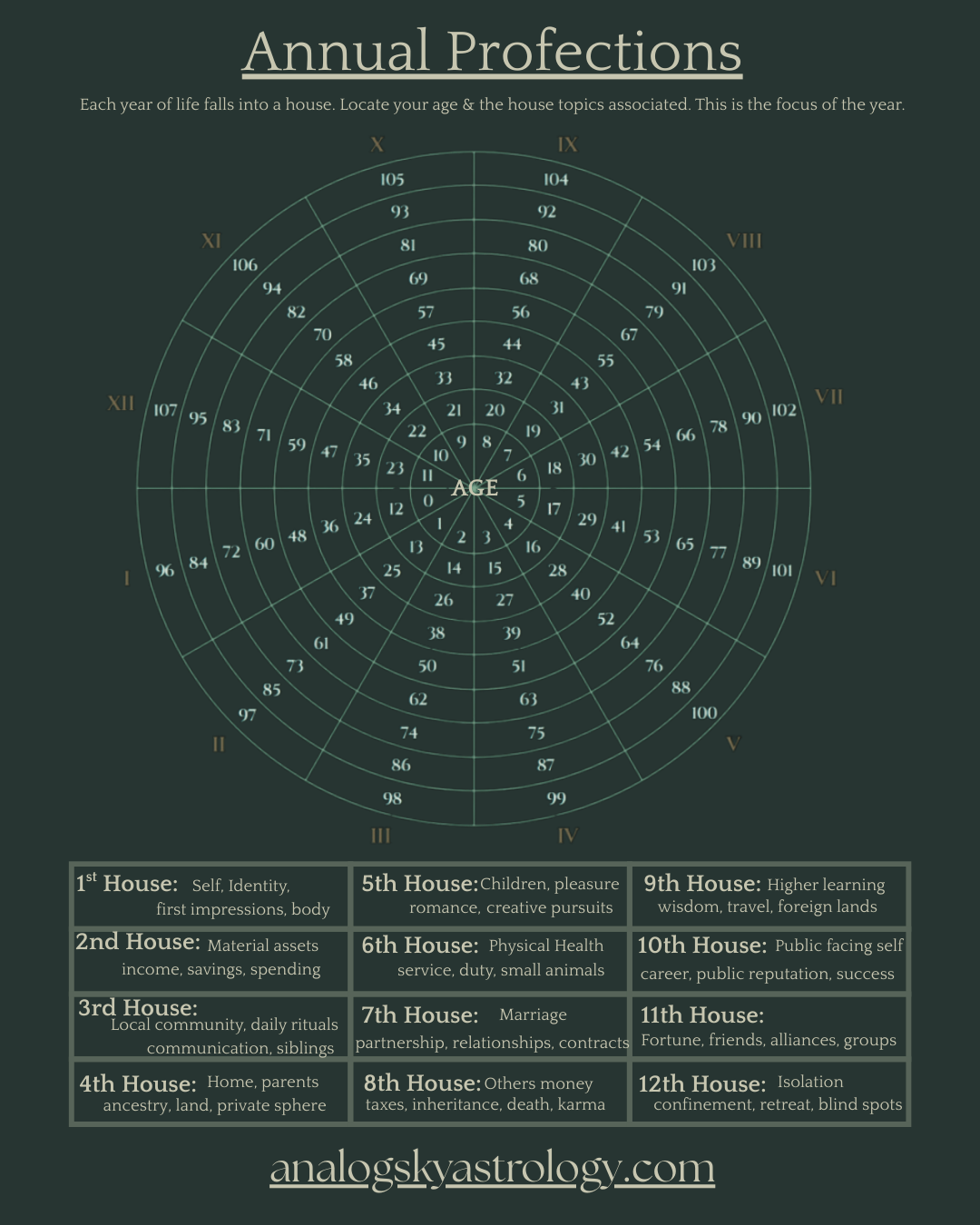 Profection-to progress or move forward. Each birthday, we move our Ascendant sign one step further in a counter-clockwise direction. Each age equates a new focus for the year.