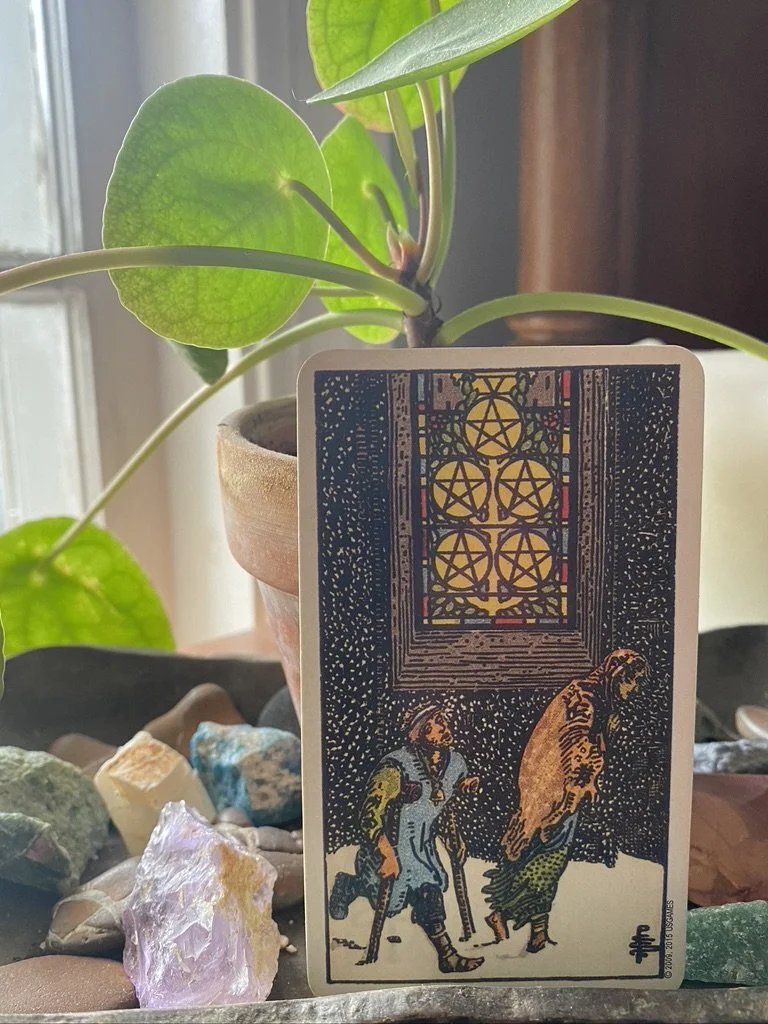 The tarot associated is the 5 of Pentacles, and is associated with material wealth, but the figures are out in the cold in front of what looks to be a church. This is just as much about spiritual deprivation as it is material.