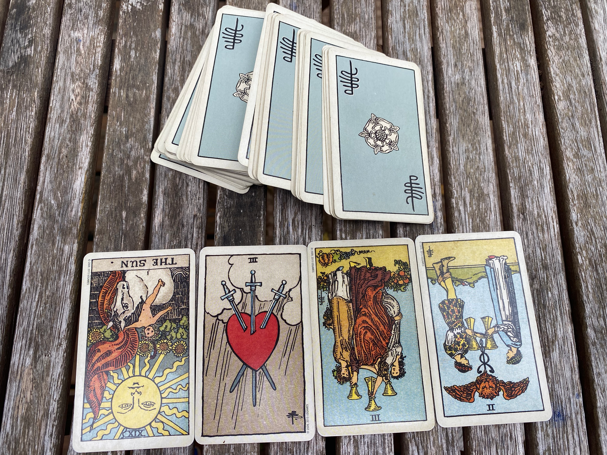 The 2nd and 3rd cards are an attempt for further insight into how the season will continue-the 3 of Swords and the 3 of Cups reversed. I first notice that we have double 3’s, which alone signify a birth or a movement towards creation. The 3 of Swords can be a challenging read, yes on its surface it can signify heartbreak, or mental anguish over the loss of love. I also interpret this card as a mental blocks that keep our own heart from receiving and equally giving love. The swords are narratives that have pierced our own perception of ourselves and/or others, and lock us into perpetual heartache and grief. If we were to draw the swords out, rewrite our story, could the wounds of our heart and head heal? Could we discover our own vulnerability again? Love is making our heart vulnerable to the experience of another.